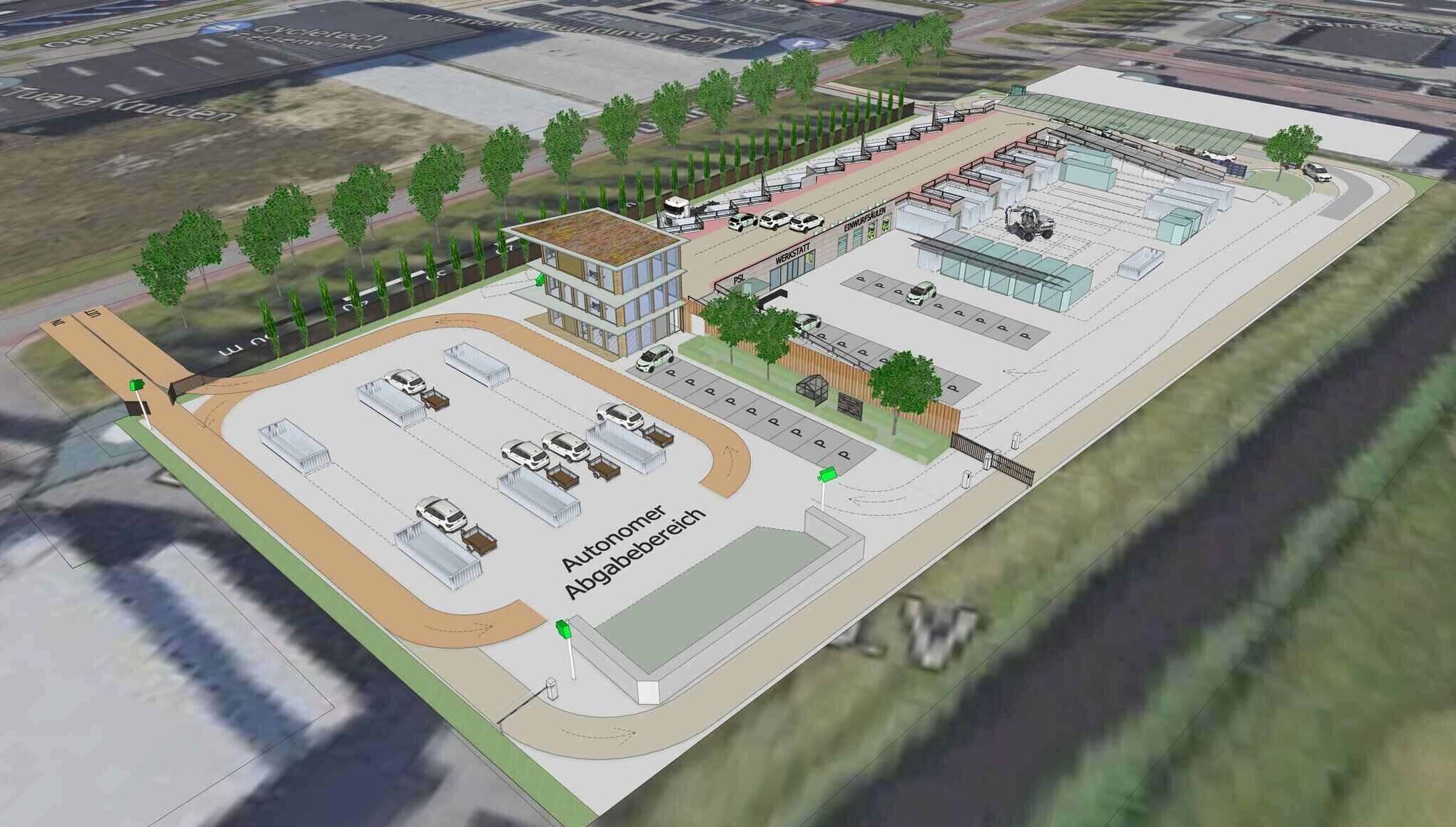 Die Machbarkeitsstudie geht über die klassische Planung hinaus: Wir integrieren Digitalisierungs- und Autonomisierungswünsche direkt in den Entwurf. Ob 24/7-Zugang, digitale Registrierung, Wiegesysteme, Bezahlung oder Kameraüberwachung – wir zeigen, wie sich diese Technologien in das Gelände und die Logistik einfügen lassen.