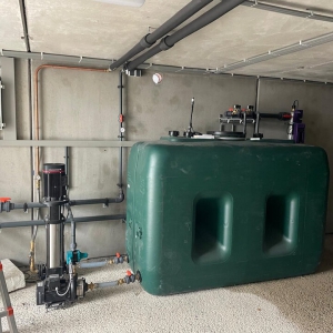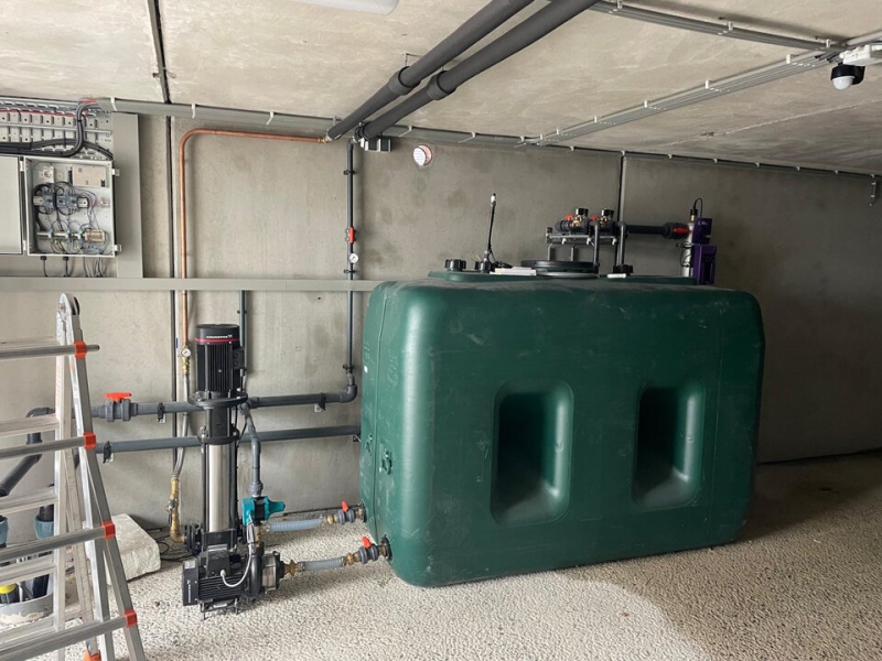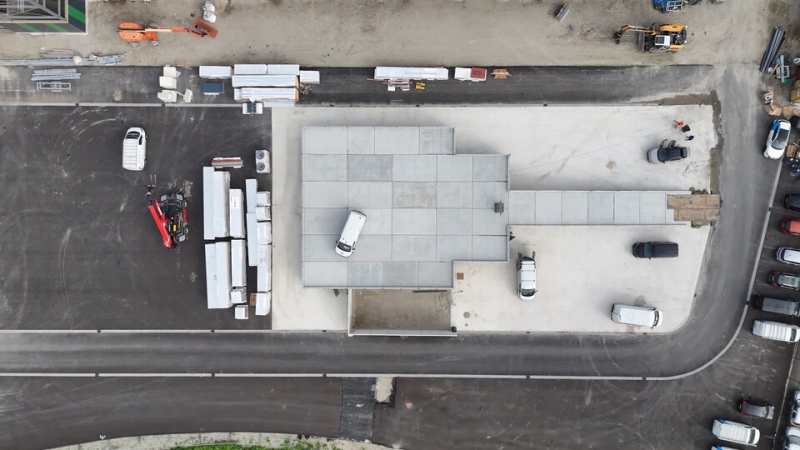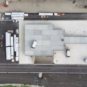 Das Podest ist 2,60 Meter hoch und aus modularen Elementen aufgebaut, die unten offen sind. Dadurch kann das Betriebshofteam auch die Unterseite des Bauwerks nutzen, welche über mehrere Doppeltüren zugänglich ist. Die Unterseite des Podests ist mit Elektroinstallationen und natürlicher Belüftung ausgestattet und bietet u.a. zusätzlichen Lagerraum für den städtischen Betriebshof. Ein Teil des Raums wird für die Wasserspeicherung mit einer Pumpanlage und einem Zapfhahn für Kehrmaschinen genutzt. Ebenfalls ist dort ein feuerbeständiges Kompartiment eingerichtet, das mit Auffangwannen ausgestattet und über eine Brandschutz-Schiebetür zugänglich ist. Hier können Treibstoff und Ölprodukte sicher gelagert werden.